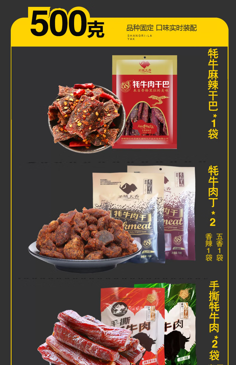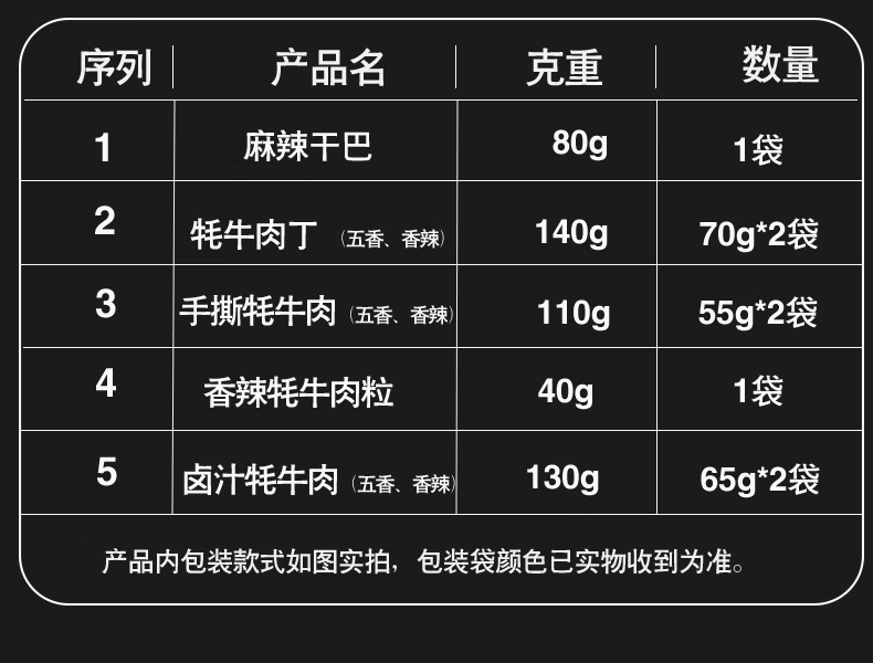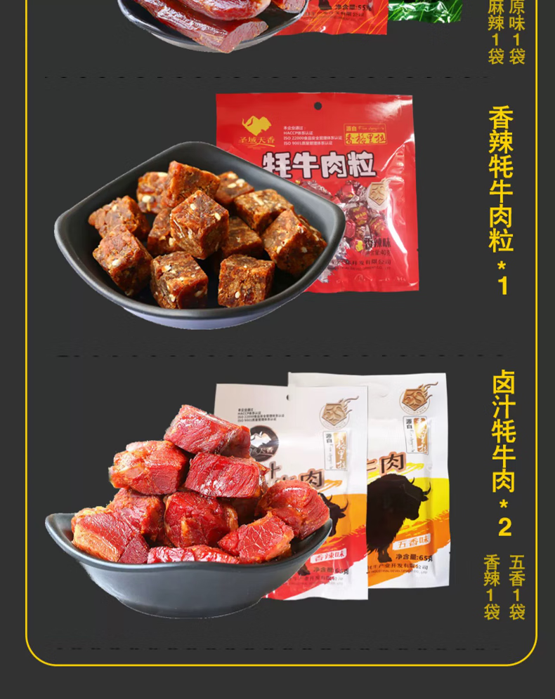 口味:80g麻辣干巴+70g五香丁+70g香辣丁+65g五香卤汁+65g香辣卤汁+55g原味手撕+55g麻辣手撕+40g香辣粒食品