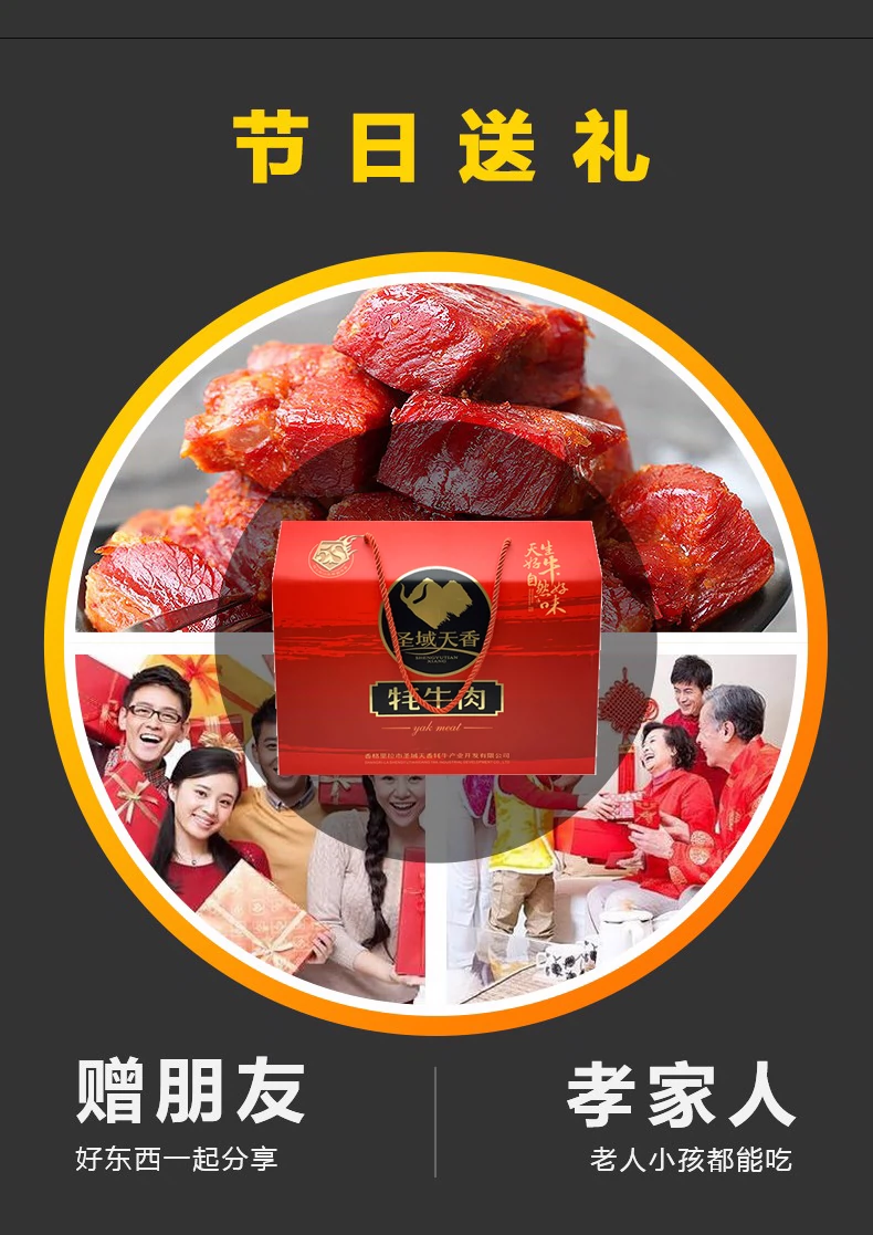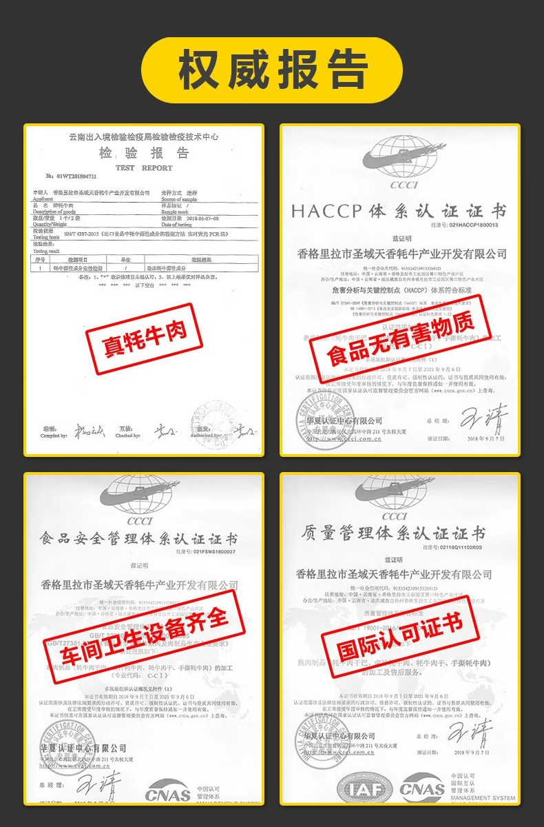 配料表:精选牦牛肉、白砂糖、盐、植物油、蜂蜜、白酒、味精、麦芽糖精、香辛料、大豆蛋白、食品添加剂(双乙酸钠、山梨酸钾)